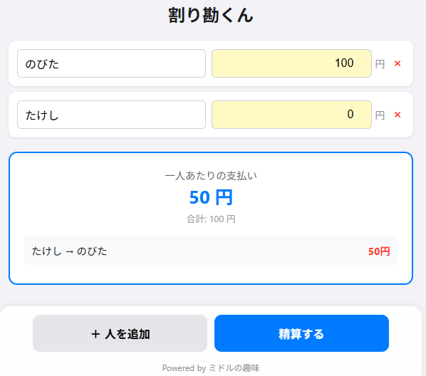ミドルのあったらいいな 2026 2/09 そのほか あったらいいな ぐるめ けいさん 2026年2月9日 それぞれで買い出したときの割り勘くん それぞれがお金を出し合った場合に、結局誰にいくらはらうの?という場合に使います。 ▶ 割り勘くんを使ってみる おつまみ りょうり 2026年1月7日 0 おでかけごはん 「焼肉 たかちゃん」 /石川県/金沢市 2025年7月24日 10 おつまみ エシャレットと味噌 2025年8月1日 6 おでかけごはん 大衆焼肉びりちゃん お初天神店 2025年10月25日 7 ぐるめ 旅行 2026年1月7日 0 おでかけごはん 「そこに肉はあるんか」 /焼肉/福島店 2025年7月24日 61 おでかけごはん 夜景シュラスコテーブル 大阪/梅田 2025年12月27日 0 おつまみ 餃子の皮でミニpizza 2025年7月24日 3 あったらいいな ミドルのあったらいいな 2026年2月9日 7 おでかけごはん 「京の焼肉処 弘」 /焼肉/京都駅前店 2025年7月24日 5 おつまみ カリカリチーズ 2025年7月24日 2 おつまみ レンジでバター醤油ご飯 2025年7月24日 36 そのほか あったらいいな ぐるめ けいさん よかったらシェアしてね! URLをコピーしました! URLをコピーしました! 釣り この記事を書いた人 darekan.com 趣味で生きていけたらを夢見る中年サラリーマン。 なお、趣味>仕事のため出世の見込みはない模様。 関連記事 釣り 2026年1月7日 旅行 2026年1月7日 りょうり 2026年1月7日 家庭菜園・観葉植物 2026年1月7日 ボードゲーム・パズル 2026年1月7日 鉄道・飛行機 2026年1月7日 神社仏閣巡り・御朱印集め 2026年1月7日 夜景シュラスコテーブル 大阪/梅田 2025年12月27日