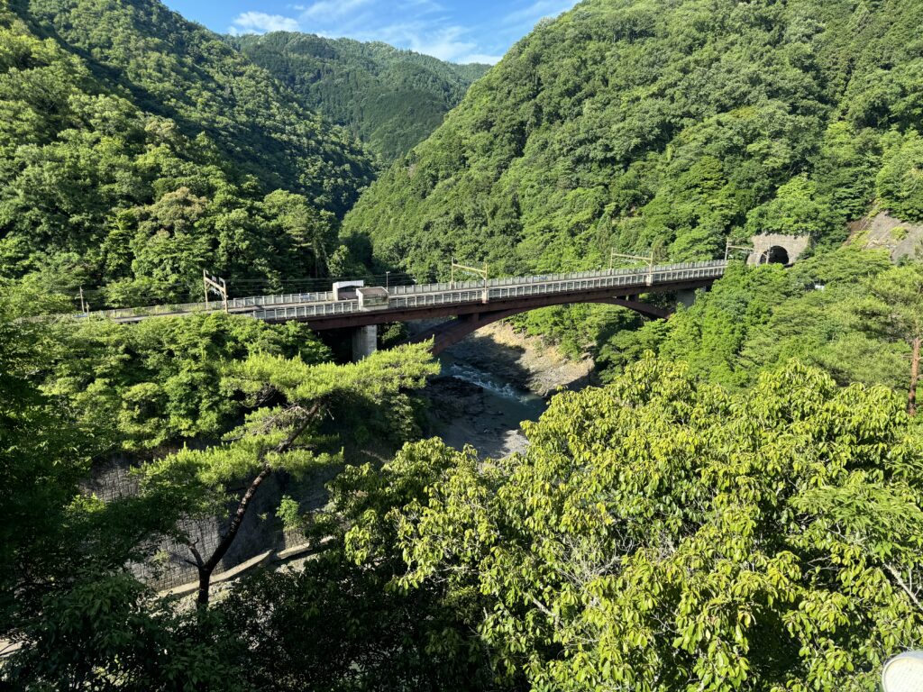 JR保津峡駅が見えるのでたまに電車に出会えることがあります。この秘境駅感たまりません。でもサッカーファンがサンガスタジアムへ行くのに必ず通る駅なので、秘境なのなのかな?